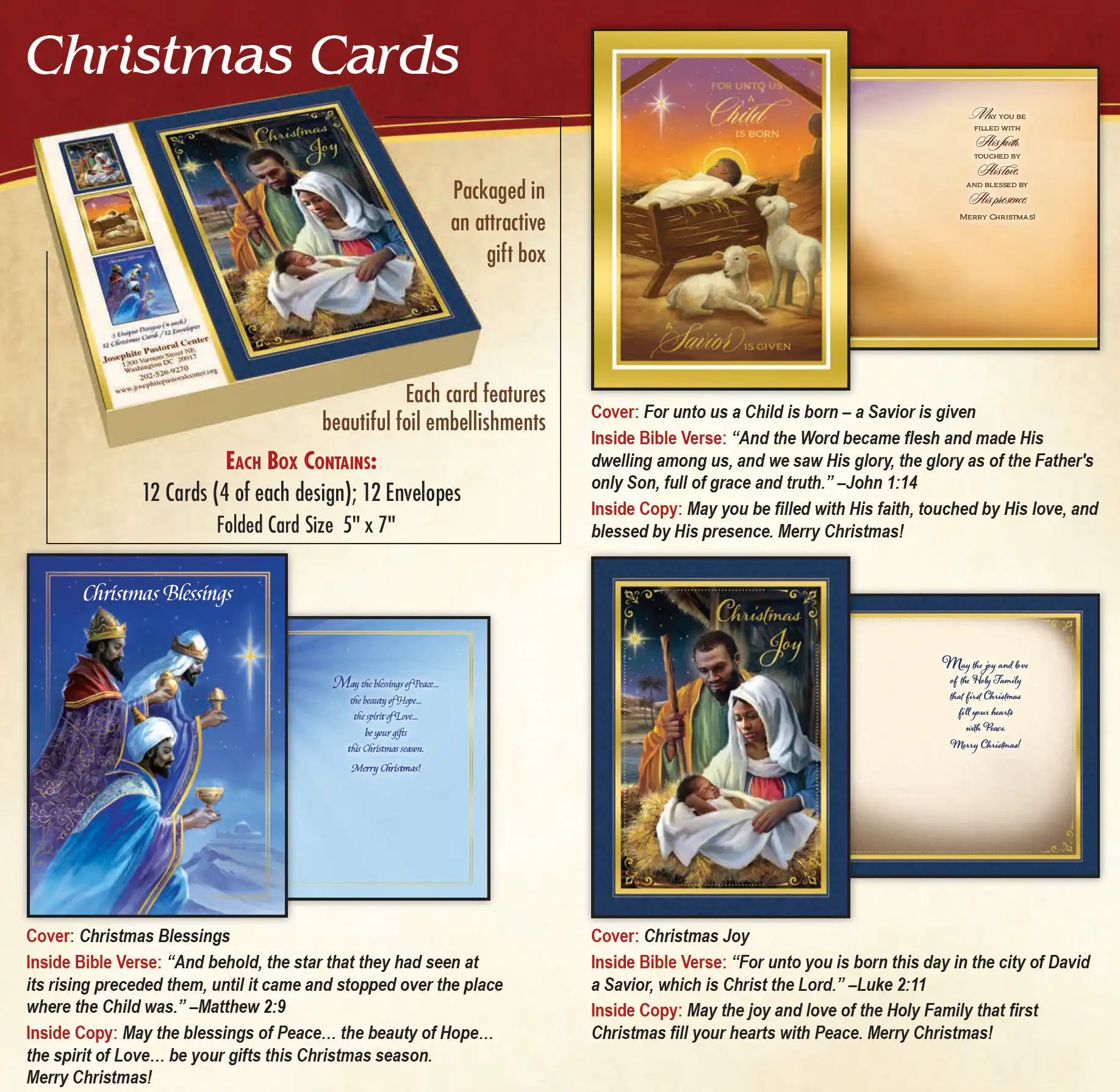 The Josephite Pastoral Center offers a box of 12 custom Christmas Cards to help you share the good news of the birth of our Savior Jesus Christ with your family and friends.