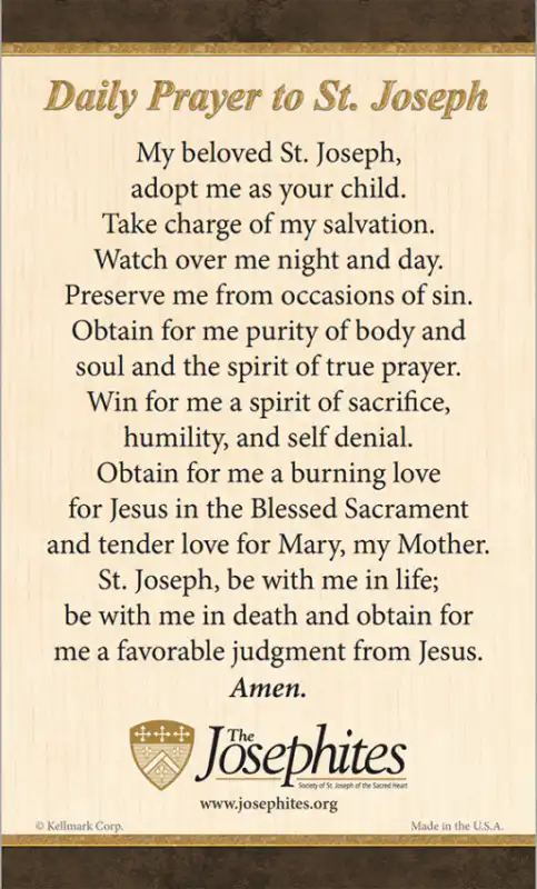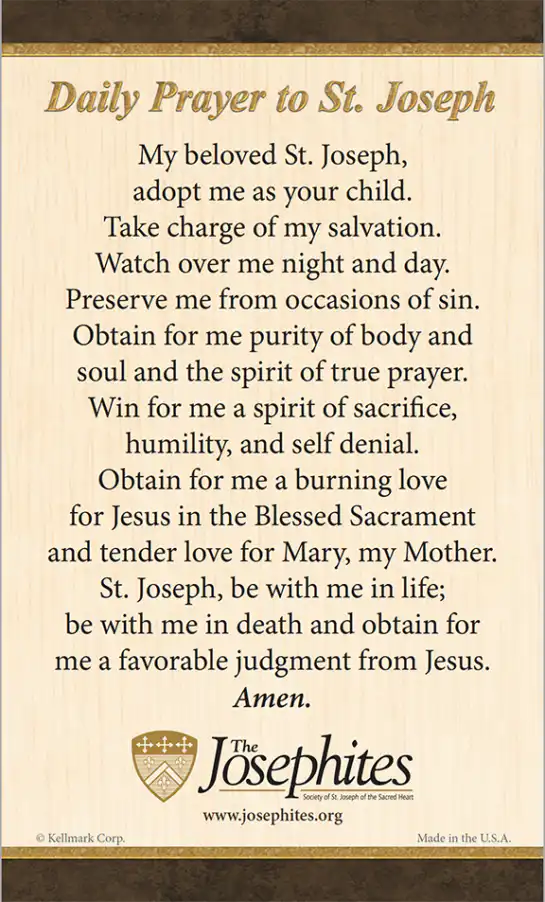 Everyone needs a Prayer Card for their wallet, handbag, brief case or even as a bookmark. This conveniently sized, durable prayer card is a regular reminder of our need for salvation and ask St. Joseph to obtain for us a favorable judgement from Jesus.